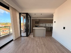 En primer piso esta unidad cuenta con un amplio living comedor con cocina integrada por barra desayunadora, balcón corrido al frente con parrilla, espacio de lavadero, baño completo con ducha, habitación con placard y habitación principal con vestidor y baño en suite.